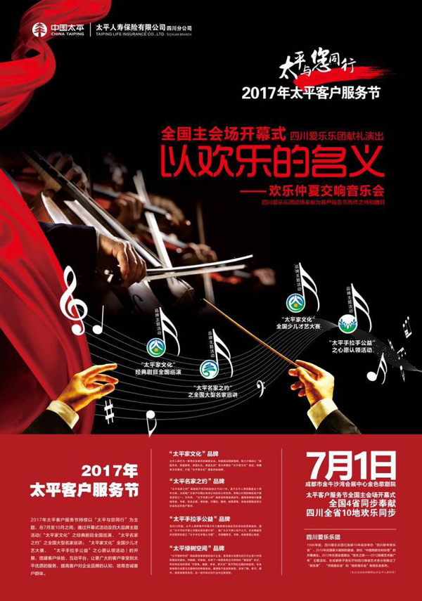 据了解,此次客户服务节将以“太平与您同行”为主题。作为今年客服节的主会场,太平人寿四川分公司将以“交响音乐会”奏响客服节开幕式的序曲。为此,四川分公司特别邀请了四川爱乐乐团于7月1日在成都国际会议展览中心金色歌剧院为太平客户献礼演出。同期,太平人寿的十家机构也将与四川分公司同步开启“少年中国说 太平演说家”活动,为客服节的启动盛大开幕。