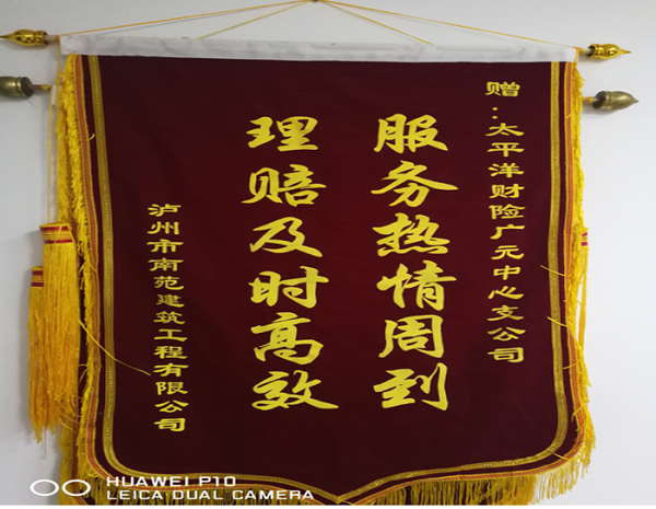 2017年7月13日,泸州市南苑建筑工程有限公司为太平洋财险广元中支送去“服务热情周到 理赔及时高效”锦旗,对该公司理赔服务给予高度评价。