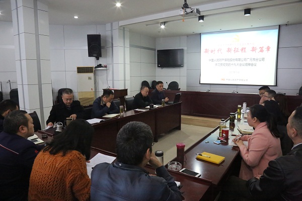 11月3日,人保财险广元市分公司组织党委中心组专题学习会议,集中学习党的十九大会议精神,安排部署党的十九大宣传贯彻工作。