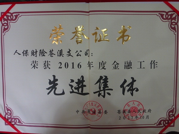 近日,广元苍溪县委县政府印发了《关于表扬2016年度财政税收审计金融国资工作先进集体和先进个人的通报》(苍委办〔2017〕96号),根据文件,人保财险广元苍溪支公司荣获2016年度金融工作“先进集体”荣誉称号。