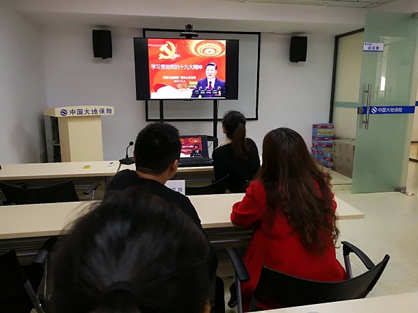 2017年11月3日,大地财险广元中支组织公司全体员工,认真学习了党的十九大精神,对党的十九大报告进行解读。