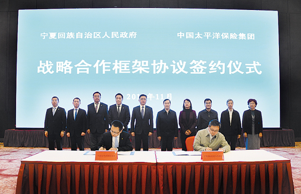 11月29日,中国太保集团与宁夏回族自治区人民政府在银川签署战略合作框架协议。宁夏回族自治区政府主席咸辉会见了集团总裁贺青一行,自治区政府常务副主席张超超以及金融局、保监局等相关单位领导出席签约仪式,集团总精算师张远瀚代表太保集团与自治区政府副秘书长王小成共同签署了战略合作框架协议。