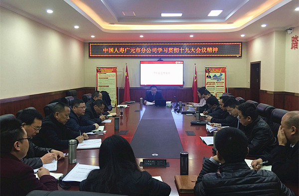 为贯彻落实总、省公司《关于在全系统迅速掀起学习宣传贯彻党的十九大精神热潮的通知》精神,根据中国人寿广元市分公司学习宣传贯彻党的十九大精神计划安排,2017年12月20日下午,中国人寿广元市分公司开展了党的十九大精神集中学习,市公司各部门负责人、各县(区)支公司经理、机关全体党员参加会议。