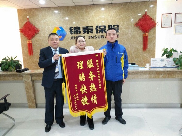 2018年1月3日,客户孟女士亲自送来锦旗,获得了“理赔热情,理赔快捷”的赞誉,表达了对锦泰保险苍溪支公司服务的高度认同。被保险人孟女士,标的车于2017年11月2日出险,标的车与三者房屋发生严重碰撞,导致车辆无法行驶,锦泰保险苍溪支公司查勘员在接到报案的第一时间赶赴现场,并第一时间对被保险人孟女士及车辆进行施救。但三者房屋位于苍溪县城5公里处,郊区居民要求赔偿3万元,锦泰保险苍溪支公司查勘员多次陪同被保险人与三者方进行调解,并积极主动与房屋主人沟通协商最终达成一致赔偿金额17000元。标的车主对我司查勘人员服务很是赞同,特主动提出赠送锦旗表示感谢。