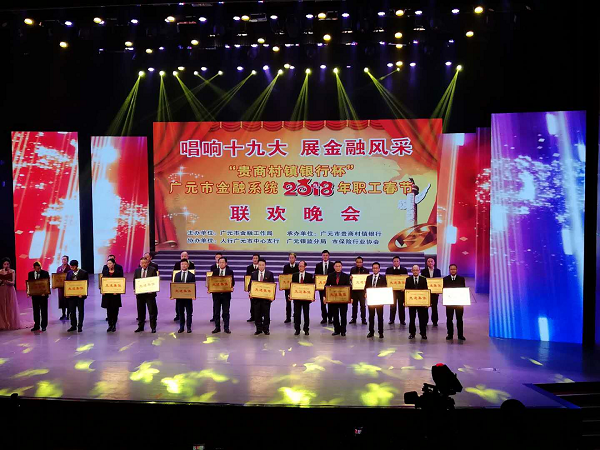 1月18日,由广元市金融工作局主办的“唱响十九大,展金融风采” 贵商村镇银行杯广元市金融系统2018年职工春节联欢晚会在广元市东正大剧院举行。会上,华夏人寿保险股份有限公司广元中心支公司喜获“2017年支持广元市经济发展先进集体”荣誉称号,中支赵苑君、牛亚琼、边术华、苟兴菊四位伙伴荣获“金融业先进个人”称号。