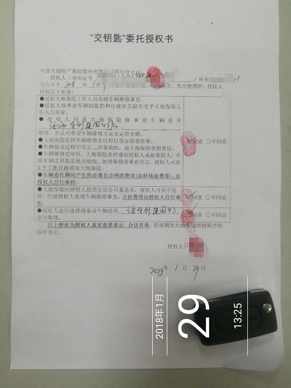 什么是“交钥匙”???在事故发生时,我公司查勘定损员进行初步的现场查勘定损之后,为方便客户,经客户同意并签署授权书后,可直接将事故车的钥匙交给我公司查勘定损员,由我公司为客户办理相关后续,如汽车维修等,在此过程中,客户不需垫付任何金额,实现0垫付,客户仅需将钥匙交付,就能解决好事故相关事宜,省时省力,便捷客户。