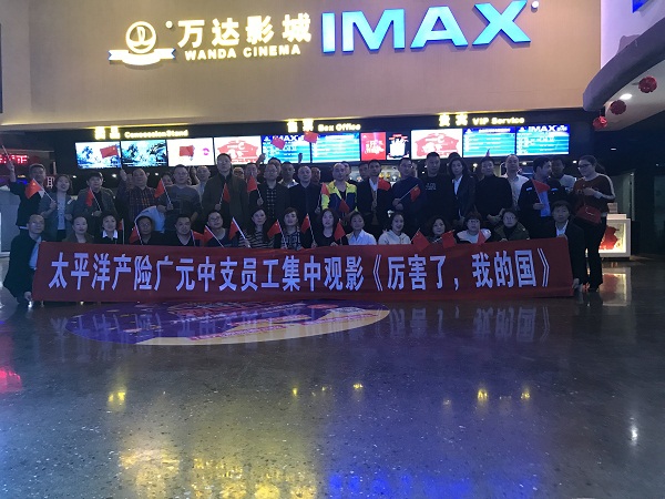 3月15日晚,太平洋产险广元中支党委组织集中观看《厉害了,我的国》专题影片,在太平洋产险广元中支党委书记李雄德的带领下67名干部员工在广元万达影城参加了观影活动。