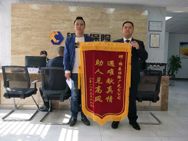 2018年3月27日,非锦泰客户李朝给锦泰保险送来锦旗,锦泰保险广元中心支公司获得了“遇难献真情,助人见高风”的赞誉,表达了对公司服务的高度认同。锦泰客户鲜伟标的车于2017年11月1日出险,标的车与三者方李朝驾驶的川HW6570普通二轮摩托车相撞,锦泰保险广元中心支公司查勘员接到报案后,第一时间赶赴现场,由于三者李朝颈椎受伤住院,高额的医疗费让本来已经拮据的家庭不能承受,当锦泰保险广元中心支公司了解到这一情况后,立即对其实施了预赔付2万元,解决了这个家庭的燃眉之急。三者车主李朝对广元锦泰查勘人员服务高度认可,主动提出赠送锦旗表示感谢,并立即在广元锦泰投保了车险。