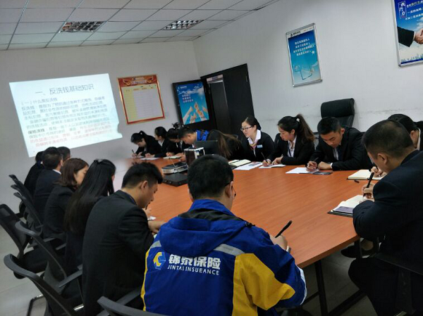 2018年3月29日,锦泰保险广元中支组织机构全体人员开展了机构反洗钱培训,培训内容以强化反洗钱基础知识、反洗钱内控制度、反洗钱法律法规以及再次强调明确了各岗位反洗钱职责。