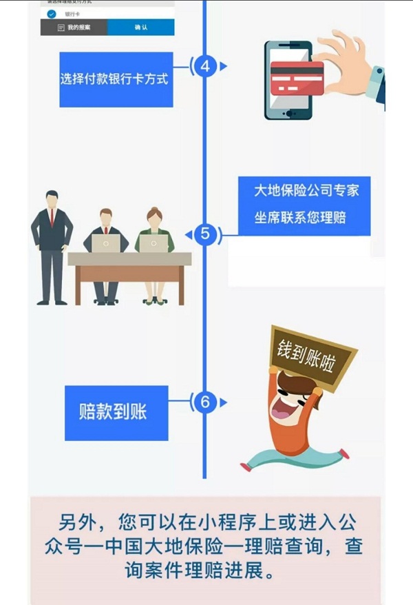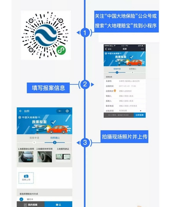 据悉,大地理赔宝是大地财险推出的一款小程序,具体的使用流程是:关注“中国大地保险”公众号或者搜索“大地理赔宝”找到小程序——填写报案信息——拍摄现场照片并上传——选择付款银行卡方式——大地保险公司专家坐席联系您理赔——赔款到账。报案结束后,还可以在该程序上查询理赔流程。“大地理赔宝”,您的线上理赔专家。