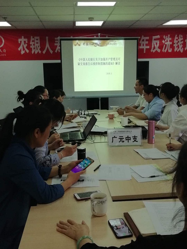 为了认真贯彻落实5月16日人民银行关于反洗钱工作会议精神,提高员工反洗钱责任意识,提升反洗钱工作水平,全面推动中支反洗钱工作深入有序开展,农银人寿广元中支于5月17日组织全体内外勤员工开展了反洗钱专项业务培训。