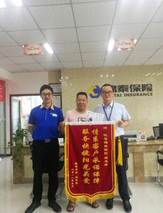 理赔服务作为保险业务的关键环节,是真正实现保险公司客户留存的关键所在。锦泰保险旺苍支公司在以客户为中心的前提下,努力做服务更好的保险公司为目标,现实超越客户期望,切实维护客户利益,获得客户称赞。2018年5月21日,客户汪怀勇为表达对锦泰保险旺苍支公司和查勘员蒲忠秀的感谢,特上门送来锦旗,获得客户“情系客户承诺保障,服务快捷阳光关爱”的称赞。