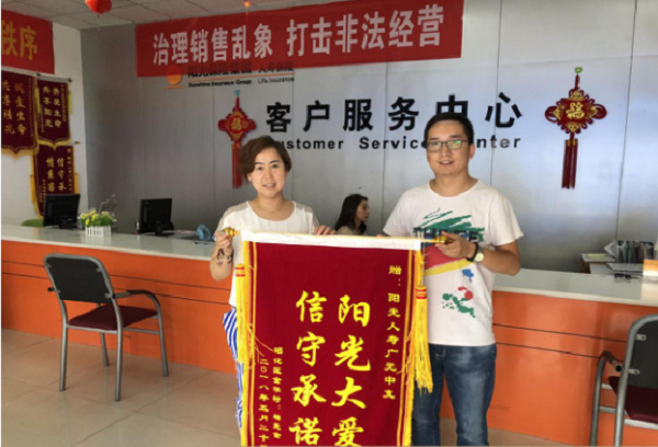 “阳光大爱 信守承诺 ” 是客户对广元阳光保险公司的肯定与赞美,广元阳光人将继续坚持“以人为本 客户至上”原则,为每一位客户提供优质保险服务。 ( 杨秦)