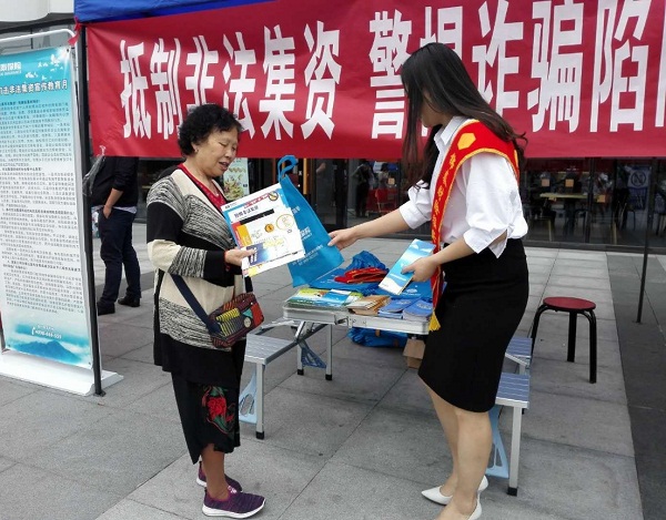 为把防范和打击非法集资宣传教育活动落实到实处,柜面服务人员负责对来办业务的客户进行面对面宣传工作,为取得一定的宣传效果,公司采取了前台张贴横幅,海报以及展架等多种多样的宣传形式。并积极开展了“防范非法集资宣传月集中宣传活动”,活动中采取向群众发放宣传资料和现场咨询的方式进行。