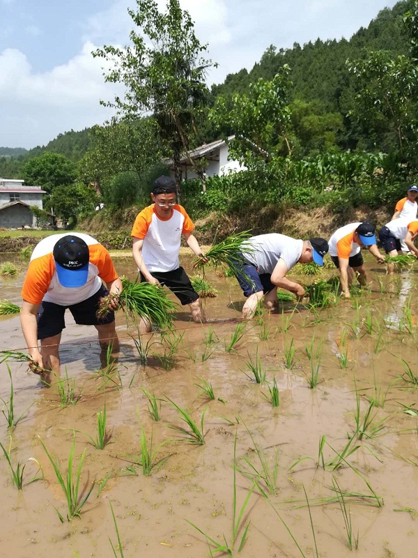 了解到两家因为缺劳动力还未开始插秧,一行人顾不得歇息,立即埋头田间进行劳作。田埂上迎风飘扬的PICC司旗和员工们统一而醒目的着装成为了星桥村和梓潼村一道靓丽的风景。