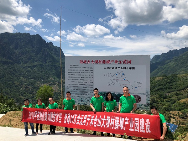 为深入推进旺苍县扶贫产业发展,2017年,平安财险广元中支协同旺苍县李县长及有关部门负责人深入米仓山镇大坝村,就当地土壤、气候等条件进行了考察调研,在充分分析论证的基础上,流转土地130亩,成功在大坝村建立藤椒种植产业园。该项目主要种植藤椒,间种魔芋和花生,其中项目基础设施包括园区主路、生产便道、渠堰、蓄水池和改土等。主要资金来源于中央以工代赈资金和平安财险捐赠资金10万余元。该园区由专业合作社承包经营,每年按合同上交利润,利润由大坝村股份经济合作社按照“3:3:4”进行分配,将为贫困户提供大量就业机会,有效带动了大坝村的集体经济收益。