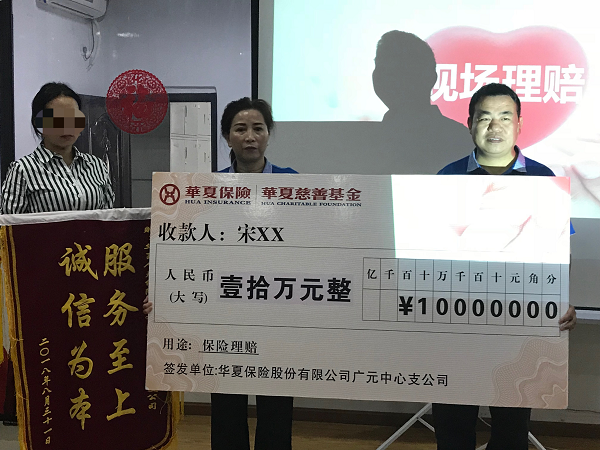 2018年8月31日,华夏保险广元中支在职场召开了一场现场理赔会。由该公司负责人将10万元理赔款亲手送至客户代表边女士手中。