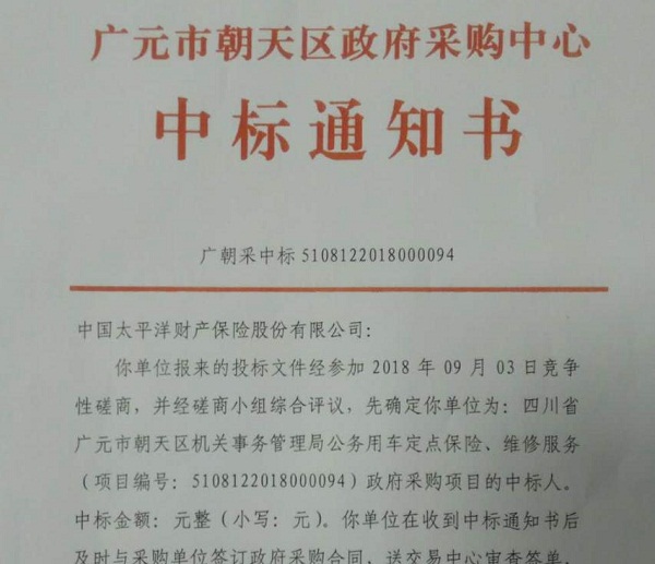 9月17日,太平洋产险广元中支成功中标四川省广元市朝天区机关事务管理局公务用车定点保险政府采购项目,成功取得2019年公务用车承保资格。