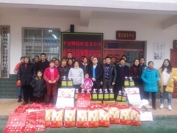 春节将至,岁寒情深。帮扶贫困户度过一个欢乐祥和的新春佳节是帮扶单位扶贫工作中的重要内容。1月29日上午,平安财险旺苍支公司总经理李林一行深入公司帮扶的麻英乡龙珠村,开展“走基层、送温暖、2019新春慰问”活动,帮扶工作队带着中国平安专属定制的新春大礼包,还有大米、菜油、年画等慰问品,在村委会广场举行了简短的慰问仪式后,为帮扶的30户贫困户送去温暖与关怀,并致以节日的问候和祝福。