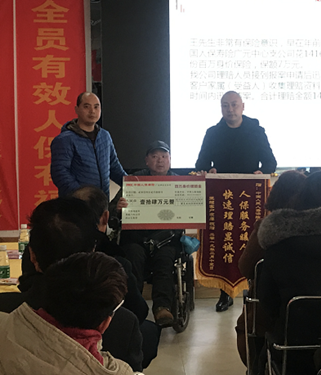2019年2月15日上午,中国人民人寿保险股份有限公司广元中心支公司在职场举行了现场理赔会,当客户的父亲王先生从该公司总经理谭兵手上接过理赔金时,由衷的对现场人员说出了心里话:“感谢人保及时的理赔,感谢人保公司优质的服务,人保公司信守承诺,一诺千金!”。